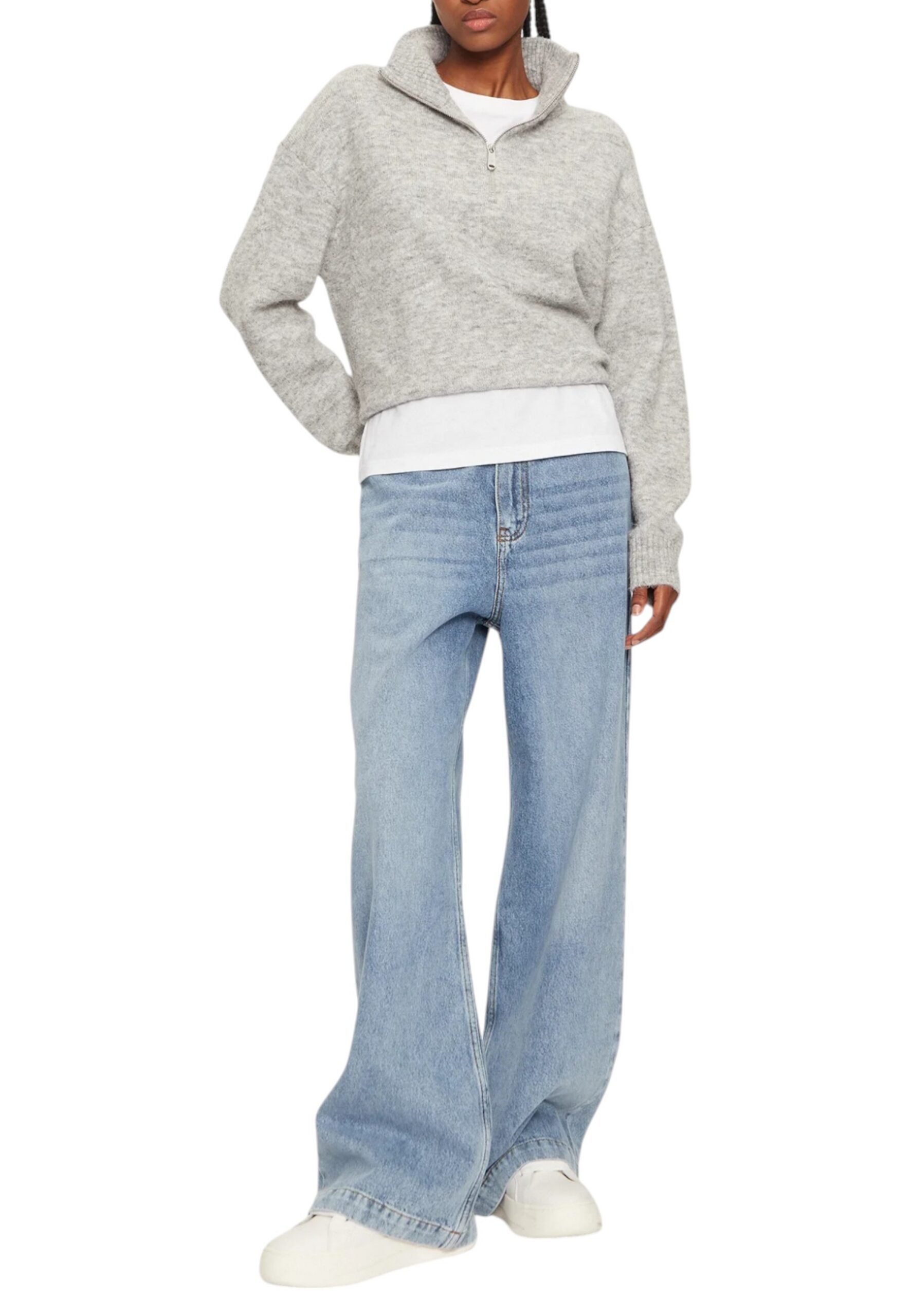 Style Smart Casual : Pull gris + jean brut + baskets blanches minimalistes → Une sophistication décontractée qui fait sensation absolue