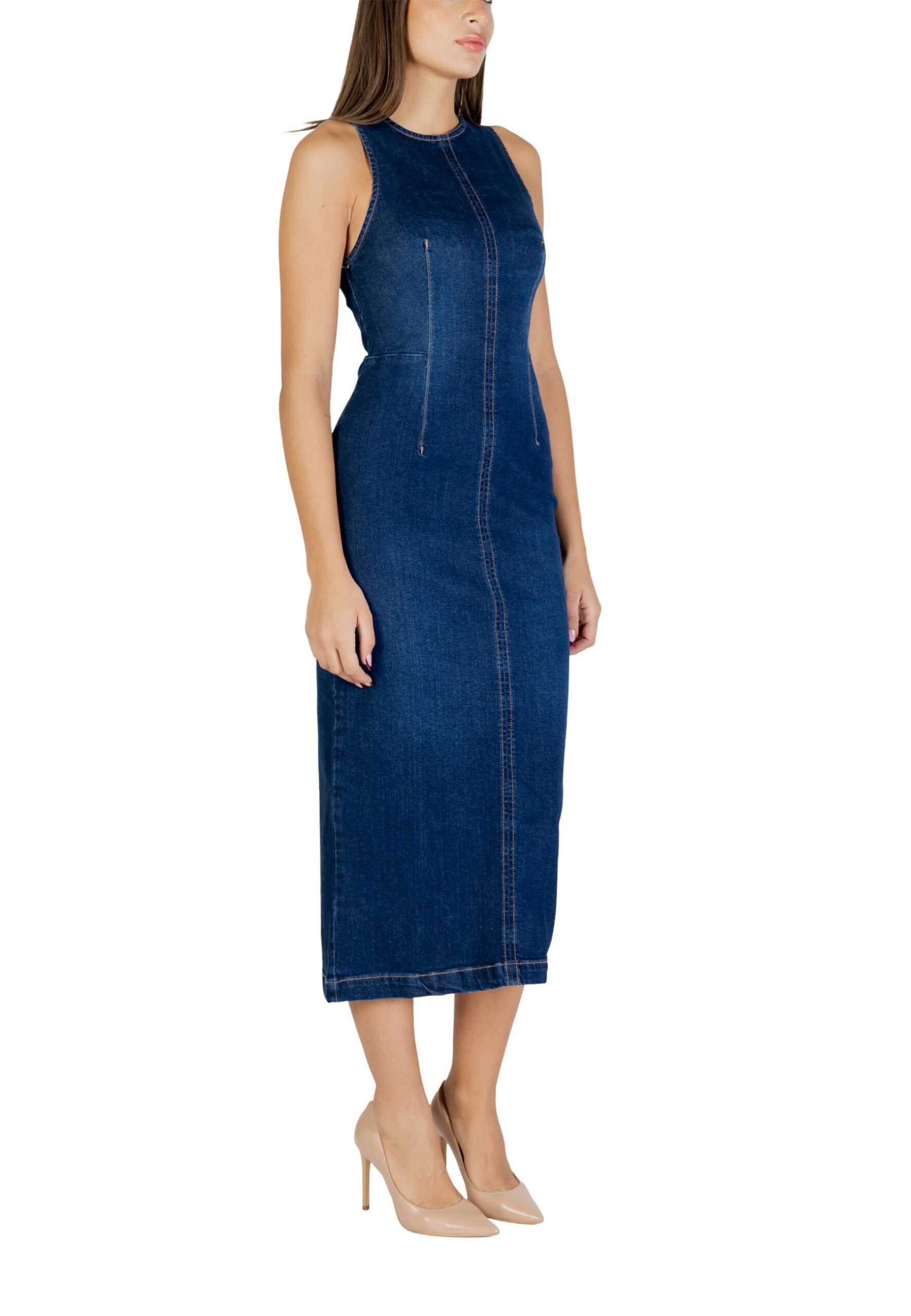 Allure Chic Moderne : Robe bleue Colcci + blazer blanc + escarpins en cuir nude → L’incarnation de l’élégance urbaine contemporaine
