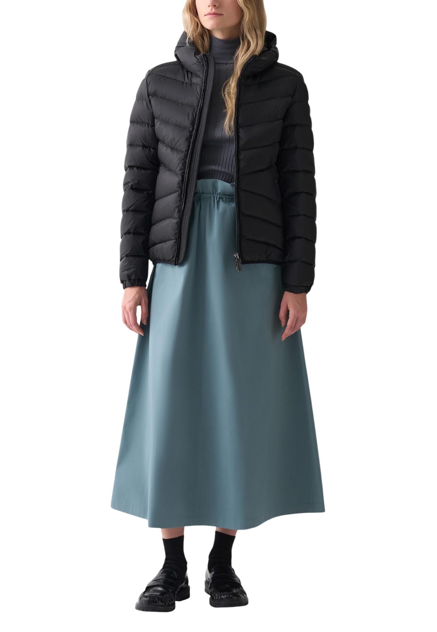 Esprit Preppy Luxe : Veste noire Colmar Originals + jupe plissée grise + cardigan cachemire + mocassins en cuir → Un raffinement sportif qui te démarque absolument