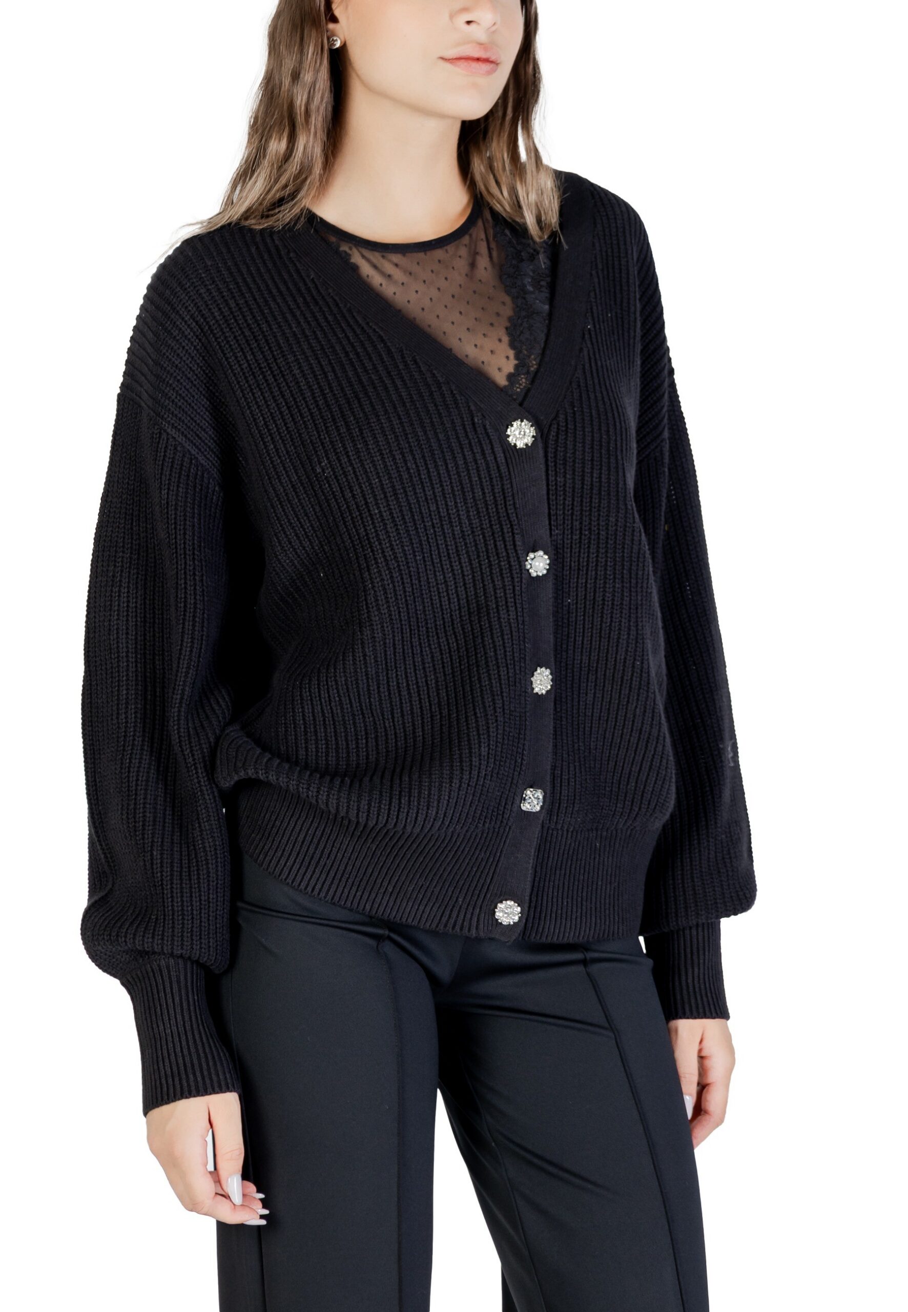 Marque: Guess Sexe: Femme Typologie: Cardigan Saison: Automne/Hiver DÉTAILS DU PRODUIT • Couleur: noir • Fermeture: boutons • Manches: longues • Encolure: en V •…